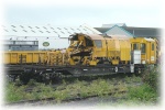 It is worth mentioning that a similar configuration of a crane travelling along a train on rails fixed to wagons had appeared in 1981 when Plasser built a skip handling train. This was intended to work with ballast cleaners and used skips, similar to those carried by lorries, being moved by four gantries working in relay. 22 flat wagons were included but the train was not a success and all the vehicles were soon withdrawn.