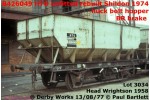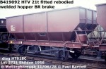 By 1966 there were 1,050 fitted 21ton coal hoppers, along with over 36,000 unfitted examples. As BR built only 23,150 wagons, this suggests that a large number of LNER wagons were still in use. Lists for 1977 show that the number of fitted hoppers, by then coded HTV, had risen to 8,552 while the HTO fleet had reduced to 17,456. Part of the decline was accounted for by the rebuilding from 1971 onwards of many wagons into 21ton (and later on 24.5ton) mineral wagons (see MDO/MDV/MEO). Once that programme was complete, work on rebodying the 21ton hoppers started. The new hoppers had the same shape as the originals but were easily recognisable by their having only two vertical ribs on each side instead of five. The new ribs were in the same position as the 2nd and 4th ribs were on the original wagons, and indeed the new wagons still had five webs between the lower hopper sides and the top of the solebars. Both LNER and BR built wagons were rebodied and the construction method was either welded (with box section ribs) or using Huck bolts (with U-section ribs). Some of the wagons were fitted with vacuum brakes, possibly not at the same time as the rebodying, and these wagons were repainted in freight brown. The unfitted examples should have been grey but it would appear that many of these were also painted freight brown as well.