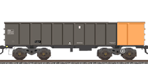 The first batch of 107 wagons was built at BR Shildon and was mounted on BR designed FBT10 bogies. Apart from the bogies, this batch differed considerably from the later batches in having regular vertical ribs on the bodysides and ends, slim top-ribs and a distinct solebar. They were put to use on the circuit from Immingham to Scunthorpe. Like the batches that followed, these wagons were designed to be unloaded by passing through a rotating tippler. To enable this, most of the wagons were built as 'inner' vehicles, with a fixed buckeye-type coupling at one end, and a rotating one at the other. A smaller quantity were 'outer' wagons, with conventional draw-gear at one end. Due to the arrangement of the couplings, correct marshalling of vehicles within rakes was critical, and the liveries were designed to ensure this. The first batch wore a dark grey livery with an orange end at the rotating coupling end. The orange was carried round the sides to the first couple of panels.