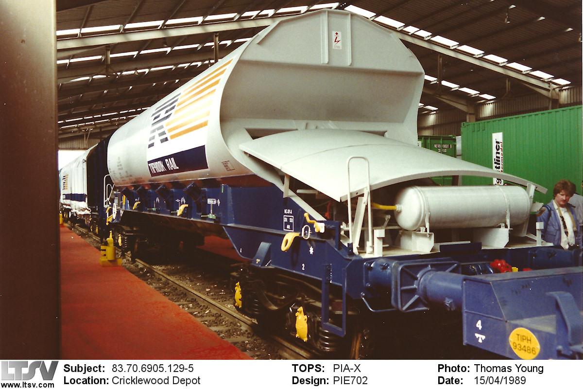 Tiphook was a new name on the UK freight scene in the late 1980s and they ordered several large batches of bogie wagons, all of which were numbered in the RIV series. 50 hoppers were built by Arbel Fauvet of France in summer 1988, numbered 83.70.6905.000 to 83.70.6905.049 and coded PIA (PIA-X to design code PIE700). The design featured a curved-sided hopper mounted quite high above the bogies, this being so that unloading equipment such as conveyor belts could be positioned beneath the hopper doors. The livery was pale grey with blue underframe and bogies, and the Tiphook Rail logo and lettering was carried prominently on the hopper sides. A second batch of 100 wagons followed from late 1989, these being similar but to design code PIE702 and numbered 83.70.6905.100 to 83.70.6905.199.