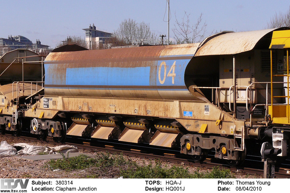 380314 is a generator-fitted HQA-B from the first new-build batch (note the different bogies, smoother solebars and absence of buffers at the inner end). When seen at Clapham Junction in April 2010, the Railtrack lettering had again been painted-out but the large set number (now defunct) was still present.