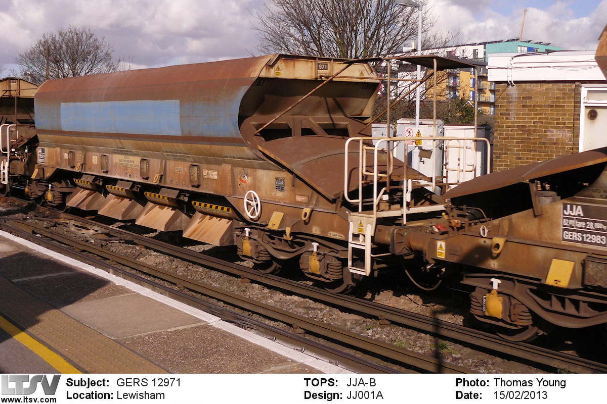JJA GERS12971 was a production batch conversion (from 33.70.6905.111-4) and was one of several to have had the ends cut flat earlier on. The Railtrack lettering has been painted out but the wagon was in need of a full repaint when seen at Lewisham in February 2013.