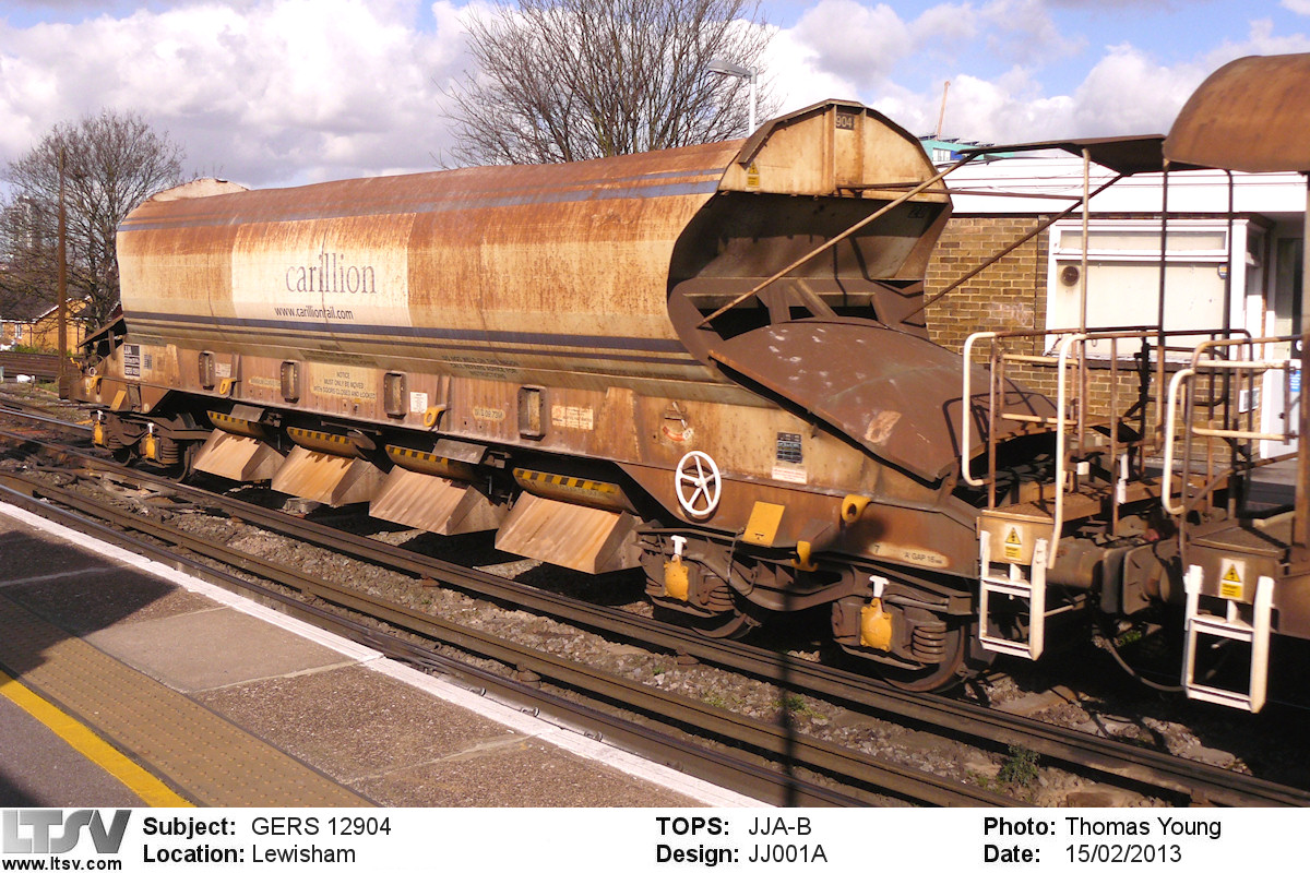 JJA GERS12904 was one of the second set of Autoballaster conversions and still retained Carillion livery when seen at Lewisham in February 2013. It was rebuilt from 33.70.6905.196-5.