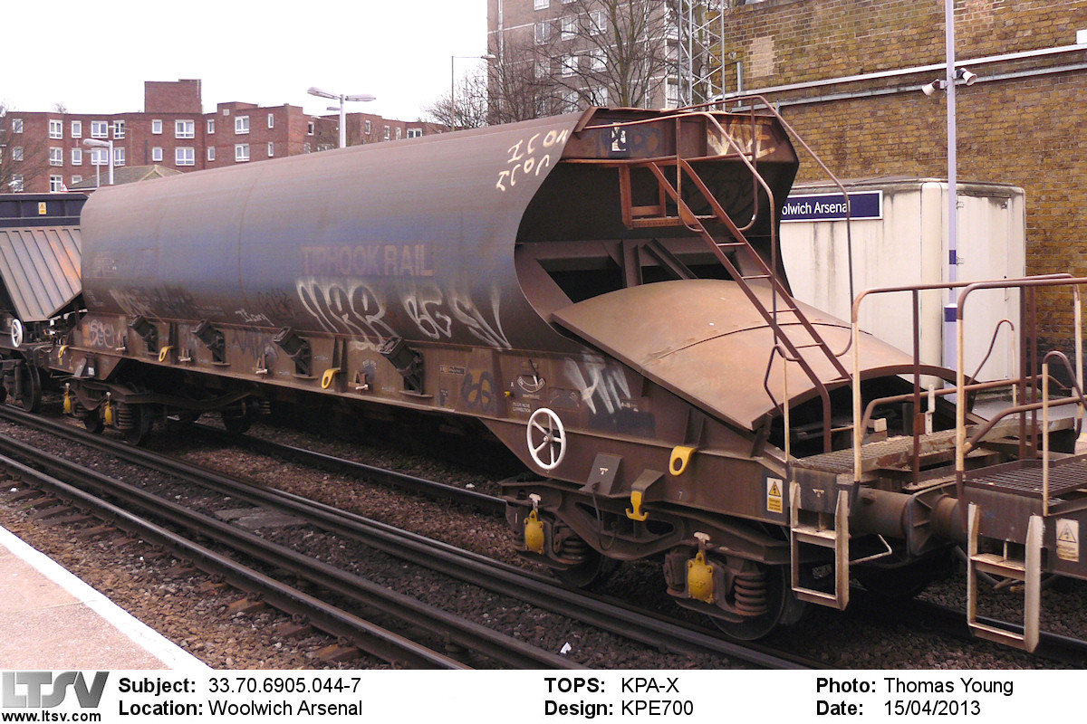 KPA 33.70.6905.044-7 is one of the 9 KPAs remaining in use in virtually original condition. Although most are still listed as being to original design code KPE700, all the survivors feature the cut-down ends that were covered by revised code KPE801. Photographed at Woolwich Arsenal in April 2013, working out of Angerstein Wharf with the new-build HLAs.
