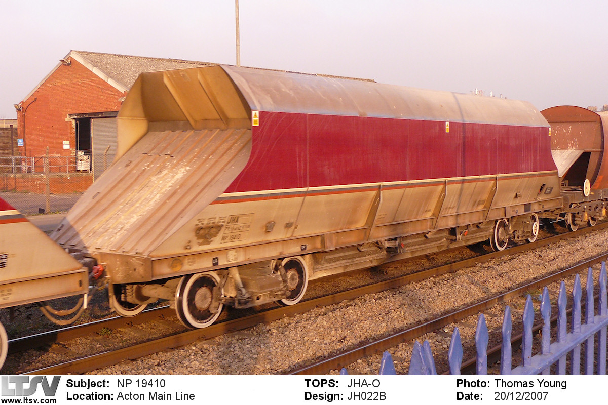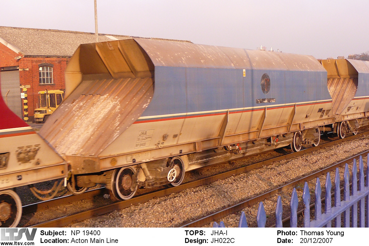 JHA Outer wagon NP19410 had been partially repainted (note that the top of the hopper sides is still blue) by December 2007. It has since been converted to an inner wagon, rebogied and renumbered as HJA 300410.