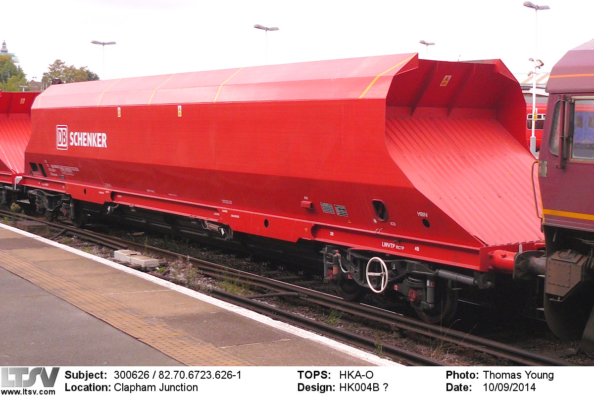 The later HKA conversions included a repaint into DB Schenker red livery and also the allocation of additional UIC numbers. The former NP19626 was carrying new numbers 300626 and 82.70.6723.626-1 when seen at Clapham Junction in 2014.