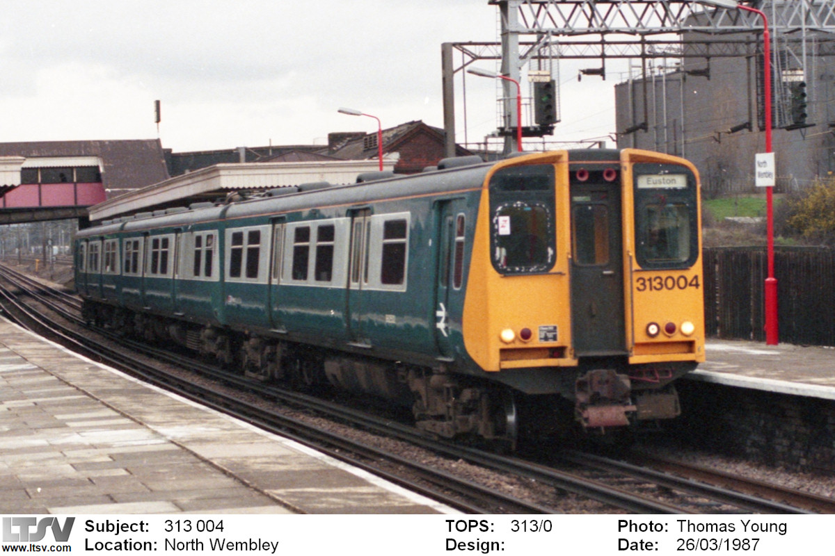 313 004 working on the Euston lines, seen at North Wembley in 1987. Note the large roof vents, and also the extra shoegear fitted to the lead bogie.