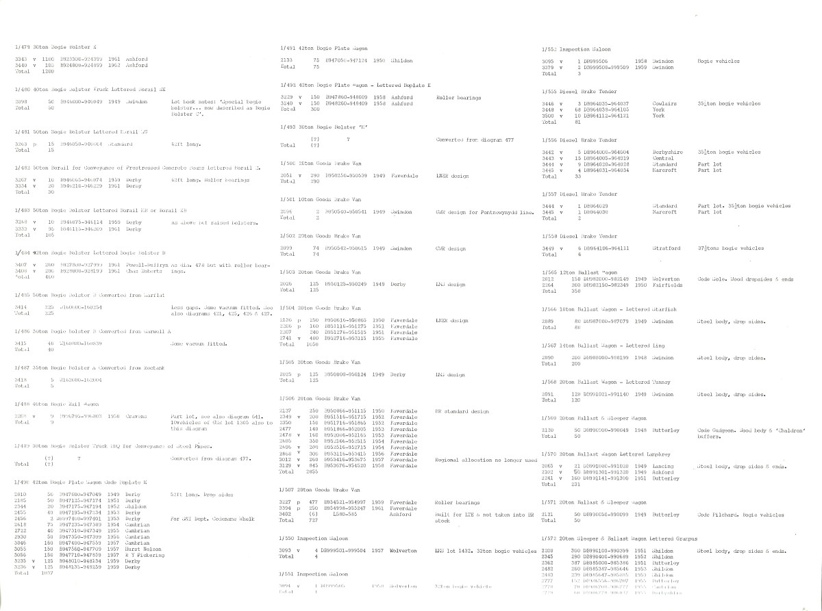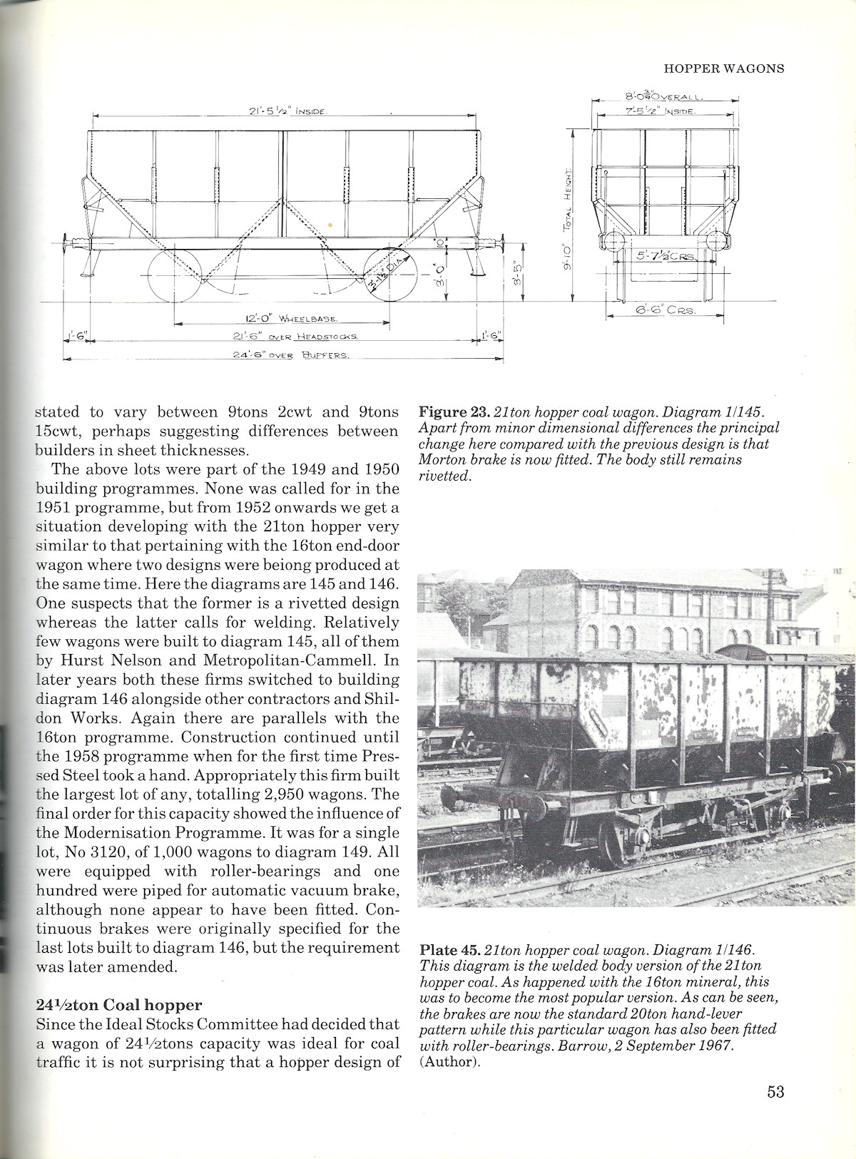 | Review: | 1985 was a good year for wagon books, with two major titles appearing. The first was actually written in 1982 and is an excellent overview of the entire BR wagon fleet from 1948 until about the mid-1960s. As the sub-title suggests, this book focuses more on the 'golden era' of wagon building, and consigns all developments since the introduction of air-brakes to a final chapter headed Apocrypha. In its favour the book does include chapters on departmental wagons and containers, and all chapters are littered with drawings (121 in total, reproduced at 1:76 scale). Most of these are derived from the BR diagrams and lack underframe details and plan views although some very interesting types are included. Another strength of this book is the appendices. The first lists the mineral wagons inherited from the Ministry of War Transport. The second lists all the number ranges used on BR wagons in this period with the lot numbers for each. The third correlates lot numbers to diagram numbers, and the fourth lists all the diagrams with numbering and build details. The mid-1960s cut off means that some types are ommitted but these appendices form a reference that I still use quite regularly. |