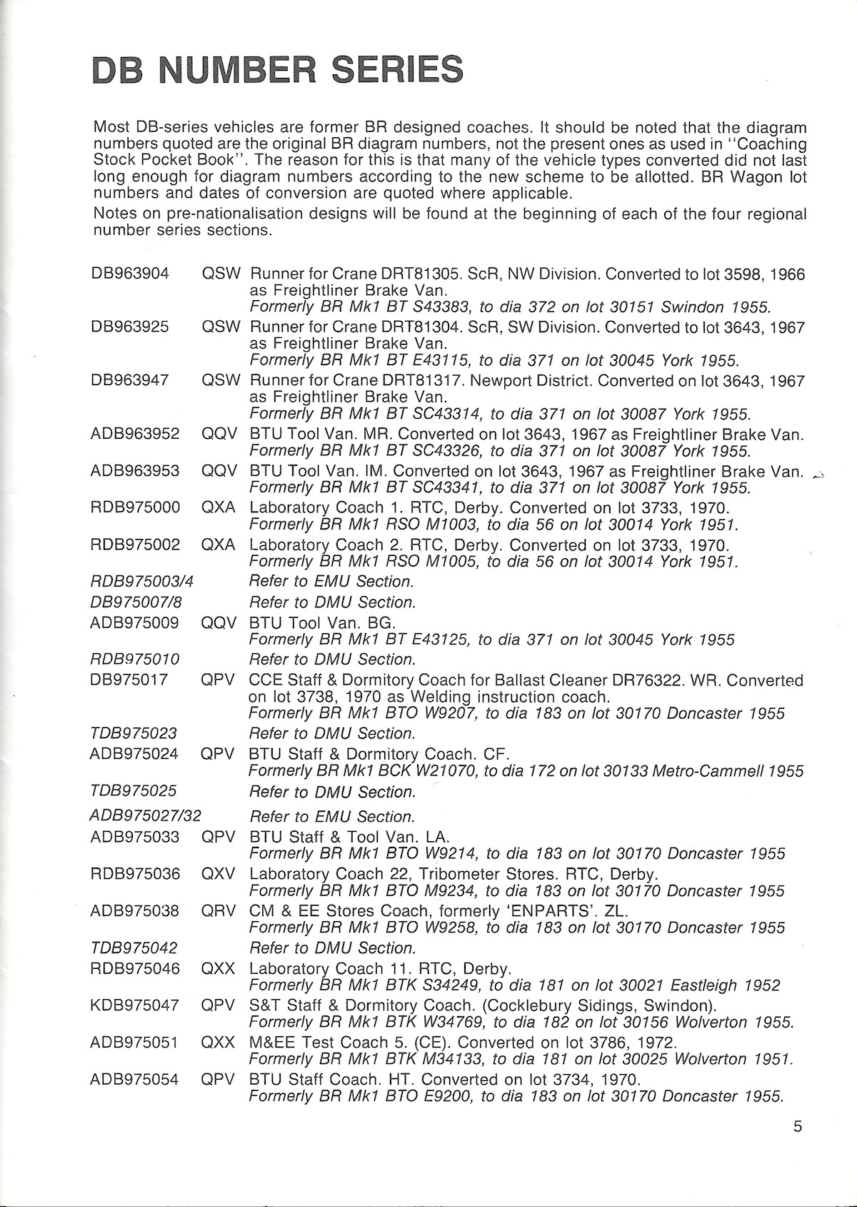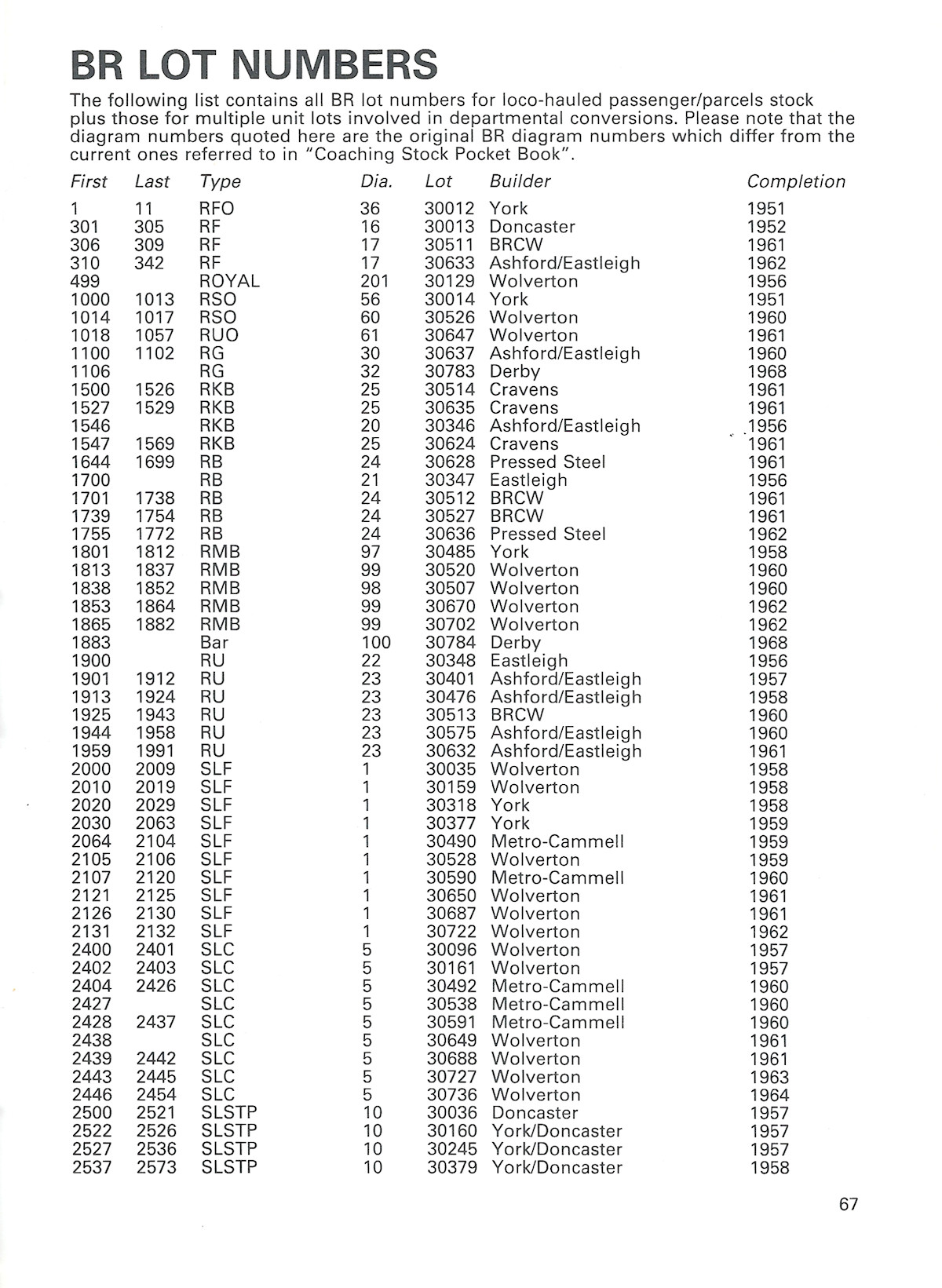 The reason that build details for BR coaches were not included was that a complete BR coach lot listing was included, thus avoiding a lot of repetition. All coaches and parcels vans were included, along with any multiple unit lots that had seen conversions to departmental stock.