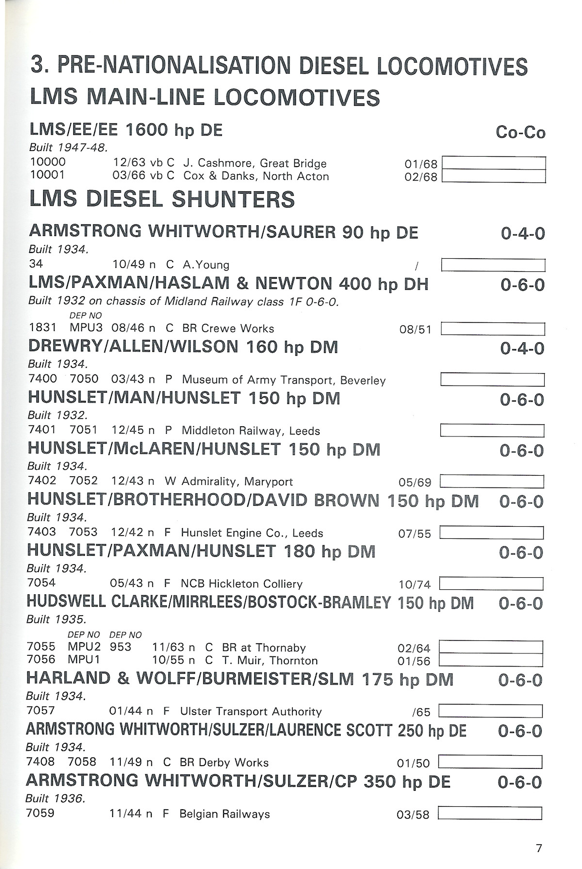 The main listing starts with pre-Nationalisation diesels. For each, the number, withdrawal date, brake and train heating at time of withdrawal, disposal and date are given.