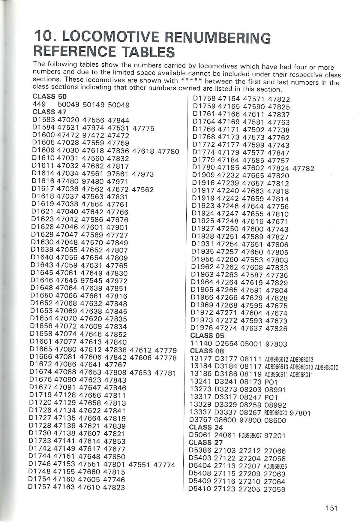 After the main listings there is a reference table showing locos that carried more than three numbers. Note the condensed font used to squeeze departmental numbers into the space available.