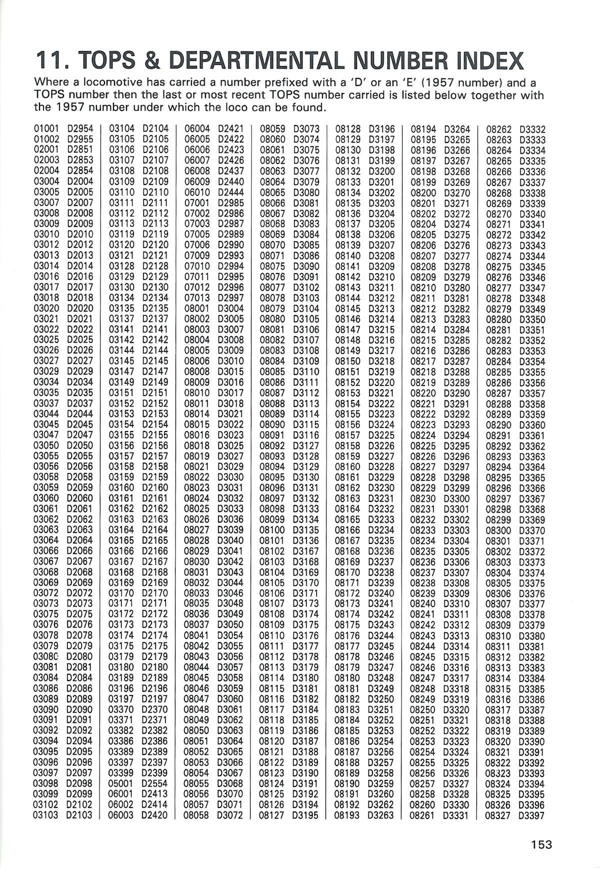 The last table runs to 8 pages and acts as an index by providing a cross reference between TOPS numbers and 1957 numbers. It should be noted that only the latest/last TOPS number is shown. For example, refurbished 37s only appear under their new numbers. In my opinion it would have been better if all TOPS numbers had been included. |