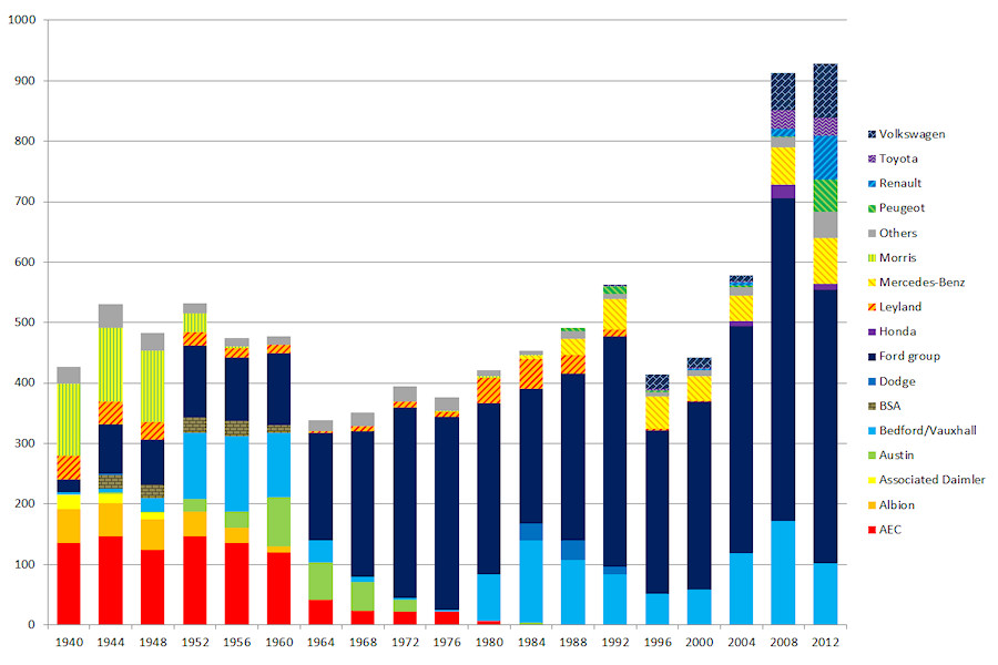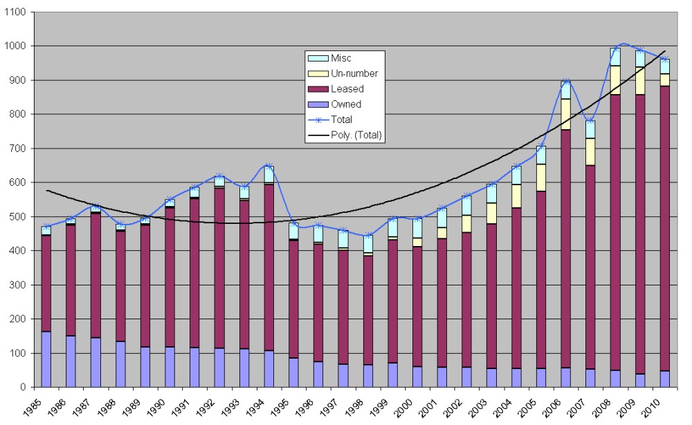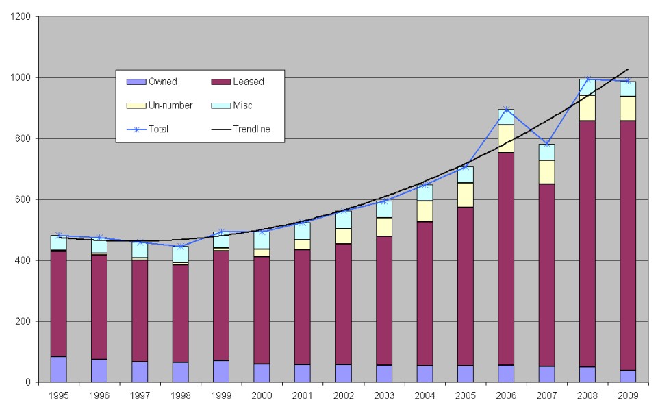 | With work on LTSV3 having hit another (temporary) technical roadblock, I put my 'statto' hat on last night to produce some updated charts of the central fleet. The first two show the intake of the leased fleet by plotting fleetnumbers against (approximate) dates of entry into service. They therefore update the ones that appeared in my article in 2006. The first covers numbers 6000 to 7500 and shows that the rate of intake slowed slightly during 2010 and 2011 but has now picked up again. ![]() The second is the same but covers the whole leased fleet from number 3000 in 1982. ![]() I have also updated the fleet composition chart that featured in this article back in 2004. The data is now more accurate and shows the fleet composition by make at 1st January every 4 years. Apart from the significant fleet growth since 2000, the recent rise of Peugeot and Renault are also apparent. Note that this chart does not include miscellaneous items (trailers, sweepers etc) or 'private' cars. ![]() |