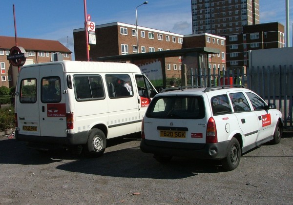 | Details: A pair of East Thames Buses vehicles were found at Becontree Heath Bus Station on 2nd October 2005. Nearest the camera is slightly dented Vauxhall Astra Estate T620SGK, while beyond is Ford Transit Minibus W302PBY. Both vehicles carried small fuel ID numbers over the filler caps. | ||||