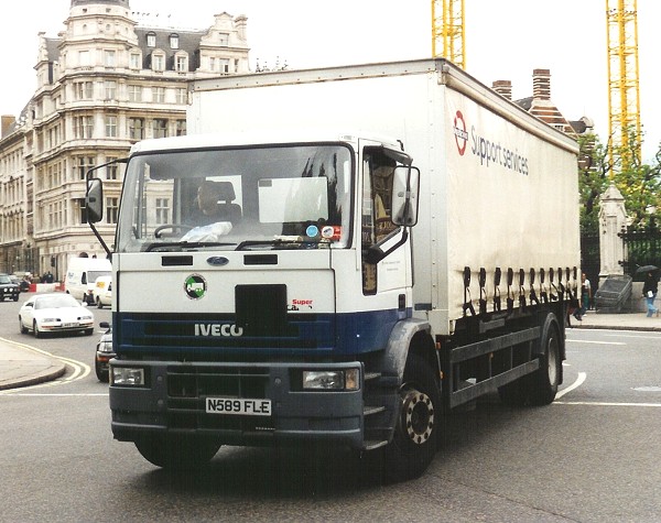 | Details: 2555F is one of two large Ford/Iveco Super Cargo demountables used by LUL since 1995. It was seen rounding Parliament Square on 17th June 1998. | |||