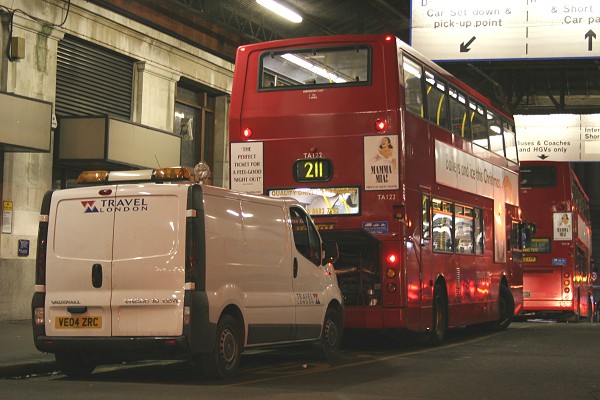 | Details: Another photo of Travel London Vauxhall Vivaro VE04ZRC parked behind a sick Dennis Trident, this time taken at Waterloo Station on 22nd December 2005. Note the spot-light and light-bar. Crew ferry Ford Transit minibuses can often also be seen at this location. | |||