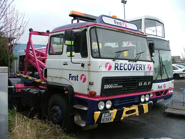 | Details: And now for something completely different! All bus companies need SVs and a few from non-London companies may be illustrated here out of interest. Seen at First Leeds' Cherry Row garage is DAF recovery truck 90075. This has been painted in the national standard livery of white, pink and purple (known universally as Barbie!) and is apparently used mainly for depot shunting. How many recovery trucks have pink jibs?! | ||