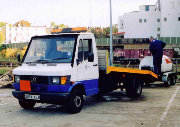 | Details: Another view of Mercedes-Benz 408D demountable 2478M (G924ALM) taken at Lillie Bridge shows that it seems to be regularly used with T70, the mini fuel tanker trailer. | |||||