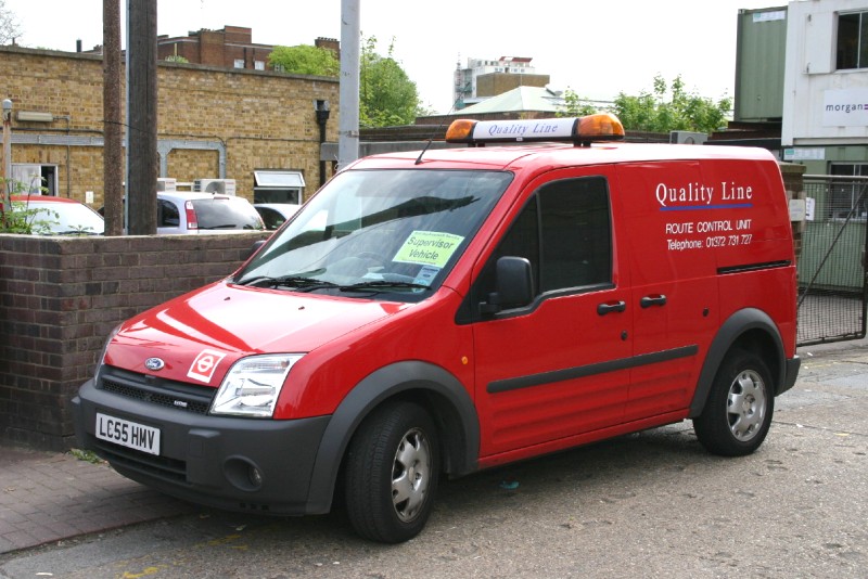 | Details: Seen some way from its normal haunts, LC55HMV is a Ford Transit Connect van used as a Route Control Unit by Epsom Buses. As with their buses used on TfL services, the traditional brown and cream livery of this long-established operator is forsaken in favour of LT red, and the Quality Line fleetname is applied. On 18th April 2006 the van was found at Acton Town station, presumably coordinating coaches being used on a railway replacement service. | |||