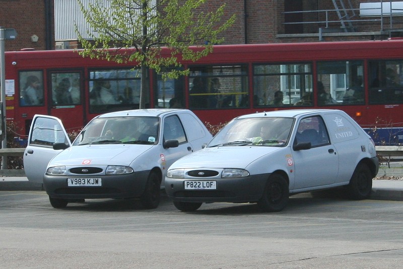 | Details: Although many of London United's crew ferry vans retain BT grey they are at least neatly lettered, with logos and fleetnumbers. Whether these are rebranded Transdev remains to be seen. At Hatton Cross on 28th April 2006 are two Ford Fiesta vans, HH4 (V983KJW) and HH8 (P822LOF). Another clue to the vehicle's origins is in the registrations. For some years, BT has registered the majority of its vehicles in Birmingham. JW and OF are both Birmingham codes. | |||||