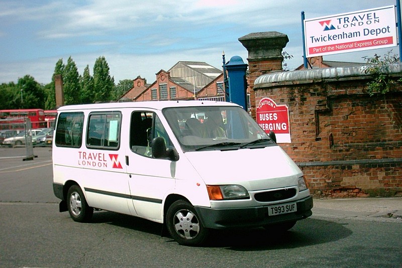 | Details: The old tram depot at Fulwell is now referred to by Travel London as their Twickenham Depot, as seen in this picture taken on 28th June 2006. Leaving the yard is one of several vehicles inherited from Tellings Golden-Miller in the shape of Ford Tourneo minibus T993SUF. | ||||