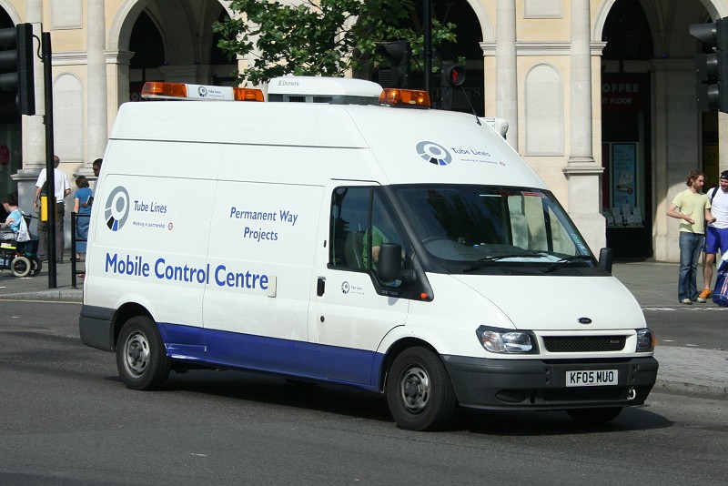 | Details: Now here is something really different, although still based on a Ford Transit. Seen at Trafalgar Square on 2nd July 2006, this Tube Lines-liveried van carried no fleetnumber, but has extensive lettering for its role as Mobile Control Centre for the Permanent Way Projects section. As well as two light-bars it has a roof-mounted air-conditioning unit and what appears to be a roll-out awning on the nearside. More information or sightings of this vehicle would be appreciated. | |||