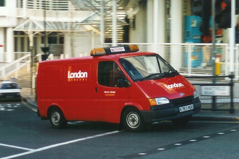 | Details: The six Ford vans in the K78xMGK series acquired by London General were all allocated matching fleetnumbers in the LGFx range. This is therefore LGF3, although the number does not appear to be carried. As the lettering shows, this was allocated to Merton garage, and it was seen at Wimbledon on 15th February 1997. | |||