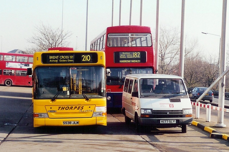 | Details: Brent Cross was the terminus of several routes operated by Thorpes and hence visited by their crew ferry vehicles. Taken before the Metroline takeover, this view shows Dart S538JLM and Renault minibus K177SLY. The KxxxSLY series is believed to be used for re-registrations rather than from new so it is possible that this vehicle earlier carried one of the KxxxFET select marks. | |||