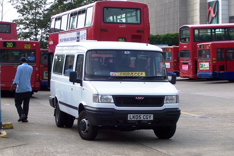 | Details: The Thorpes name is gradually disappearing from buses in North West London following the takeover by Metroline in 2004. However, it was still being displayed by this LDV Convoy minibus seen at Brent Cross Bus Station on 5th August 2006. These vehicles are used on crew ferry runs from the relatively remote garage at Perivale West. | |||