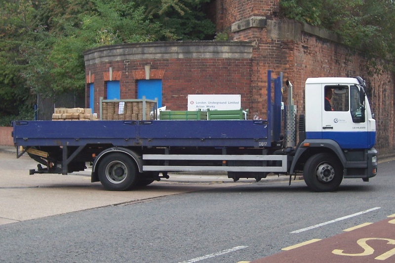 | Details: The four MAN demountable lorries delivered in April 2006 proved to be quite camera-shy, and Ray was the first to capture one, on 23rd August that year. Leaving Acton Works, 2587 had body DB17 fitted. Although broadly similar to earlier MAN 2579, there are a number of differences. Being demountables, the new trucks have a tuck-under tail-lift and hence lack the large tail-board seen on 2579. There is no crane behind the cab and, although a high-level exhaust pipe is fitted, this is not as tall as 2579's. | |||||