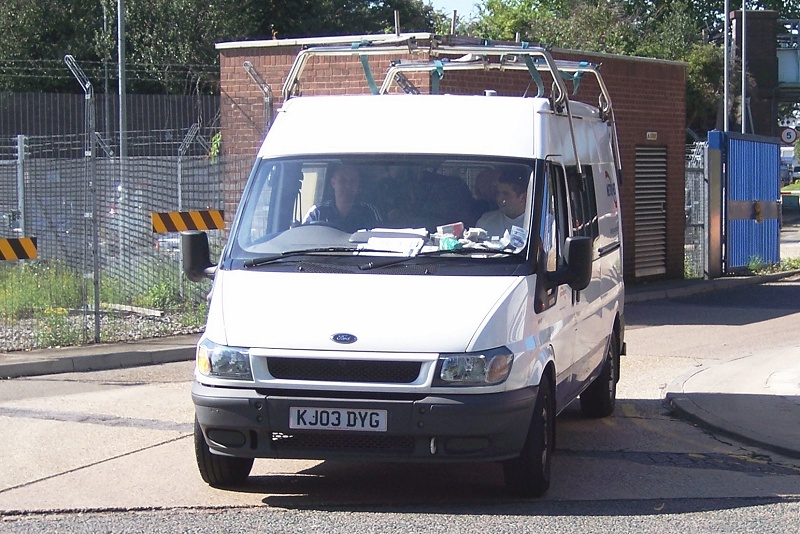 | Details: Ford Transit mid-height crew van 5414F was new in April 2003 but managed to evade our cameras until 25th August 2006, when Ray found it leaving Acton Works. Carrying standard Metronet livery, this is one of several such vans to carry an unusual type of roof rack, the purposes of which are unknown. Note the two handles extending down each side. | ||||