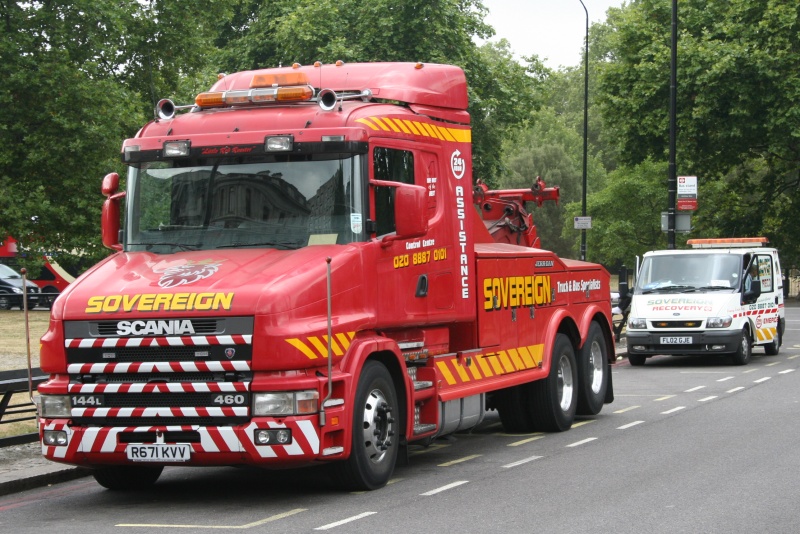 | Details: Sovereign R671KVV stood out from the rest of the fleet by virtue of its red livery, and also its normal control configuration, bonneted Scanias being particularly rare in this country. It could often be found at Park Lane, as seen on 22nd July 2005 when it had Transit Van FL02GJE for company. | ||||