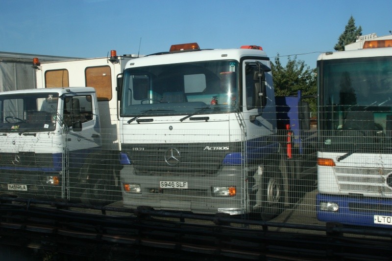 | Details: A contrasting trio of Mercedes-Benz trucks in the lorry yard at Acton Works on 3rd November 2006 centers on Actros flat-bed 2571M. To the left is demountable 2534M, not seen on this site before. Can anyone identify the body this is carrying? It appears to be a box van with two (boarded) windows in the front and corner-mounted beacon lights. Could this be 'Mobile Office' DB8? To the right is Econic dustcart 2583M. | |||||