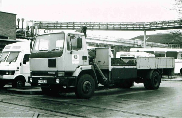 | Details: Photographed at Acton works in 1990 is Leyland Freighter 1613 Dropside Lorry 2395L (A395SJD). This truck was delivered in 1983 and featured a hydraulic crane (note the stowed stabiliser behind the front wheel). | ||||