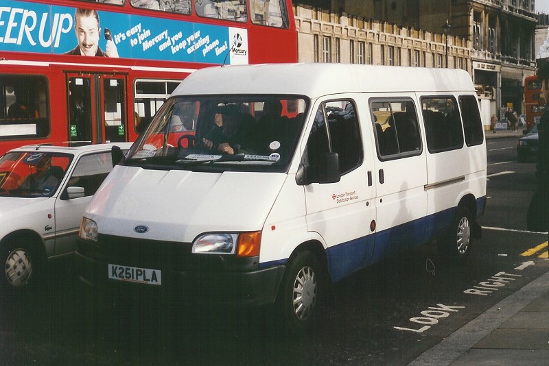 | Details: One of a pair of long-wheelbase Ford Transit minibuses bought in September 1992, 2502F gave a creditable 10 and a half years service. It was seen on Bridge Street, Westminster, on 2nd February 1994 with Jubilee Line Extension notices on the dashboard. The combination of round-cornered headlamps and plain bonnet was used between about 1992 and 1995. | |||