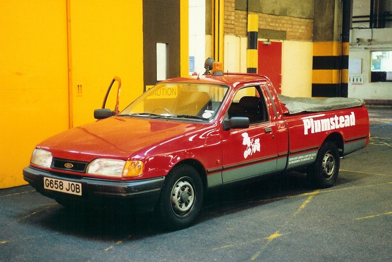 | Details: The Selkent bus operation received three of these Ford P100 pick-ups in May 1990, all of which wore the current bus livery of red with a grey skirt. All three also carried the name of their home garage and the Selkent hops logo, and had roof-mounted beacon and spot-lights. 3891F was seen inside Plumstead garage during the open day on 20th July 1991. Note the tarpaulin across the load space, and the application of legal lettering to the skirt. | ||||