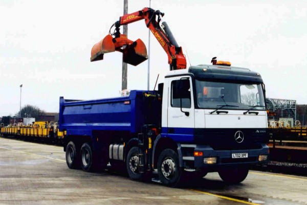 | Details: One of the largest members of the current fleet is this Mercedes-Benz Actros 4-axle tipper truck, delivered in 2002. 2578M (LT02XPF) is fitted with a hydraulic grab (seen here extended) and replaced a smaller Mercedes-Benz tipper (2538M). | ||||