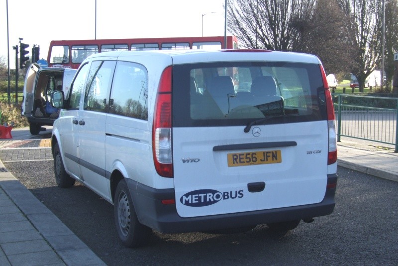 | Details: A rear view of Metrobus Mercedes-Benz Vito minibus RE56JFN at Addington Interchange on 6th December 2006 shows the model designation of 111 CDI and the sleek lines of the design. The van in front belonged to one of several contractors engaged on cleaning and light maintenance of LBSL infrastructure, hence the roundel on the rear. | |||