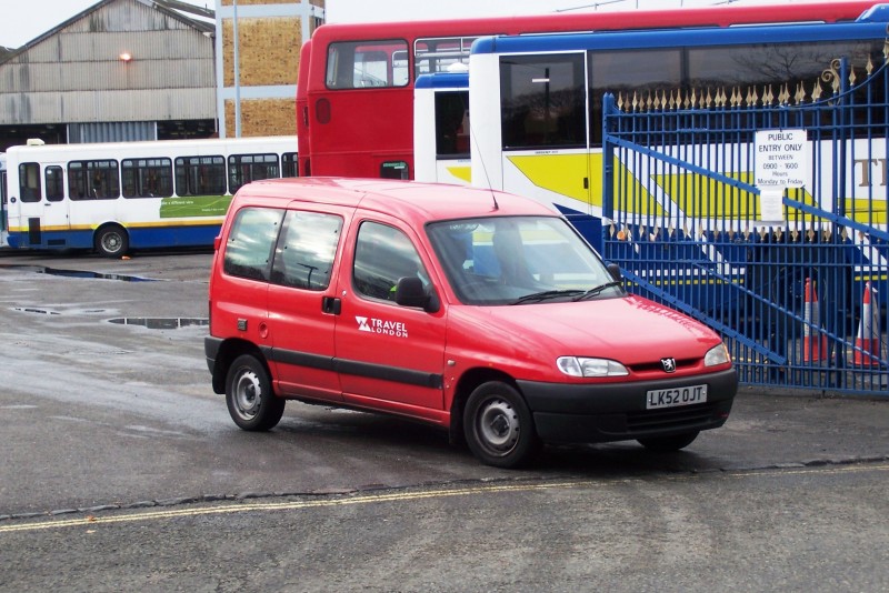 | Details: Now this is a much more suitable vehicle for transporting bus drivers, assuming that that is its role! Travel London acquired at least two of these Peugeot Partner estate cars in late 2006, possibly from the Royal Mail. LK52OJT was caught leaving the Twickenham depot on 30th December 2006. In the background can be seen two coaches still operated by TGM, training buses L2 and L3, and one of the Northern-Counties bodied darts that Travel London inherited from TGM. | ||||