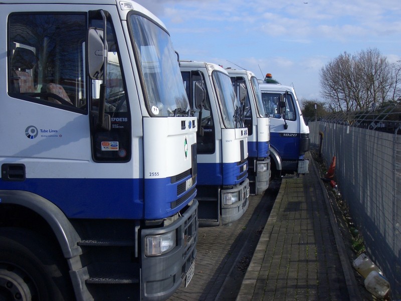 | Details: After seeing new Actros 2591 in action at Acton on 6th March 2007, the other trucks seemed feeble by comparison. However, it was nice to be on the right side of the fence for a change. This line up of three IVECO-Ford Super Cargo trucks shows once again the height differences. All three have the same cab, the difference being made up by the bumper and cab steps. 2547F in the centre is a 110E15 and has two steps and a shallow bumper. It is flanked by 2555F and 2524F, both 170E18 models, with tall bumpers and three steps into the cab. The line-up is completed by Mercedes-Benz 1820 flatbed lorry 2553M. Note that the sunshield and light-bar above this belong to Actros 2578M parked beyond. | |||||||