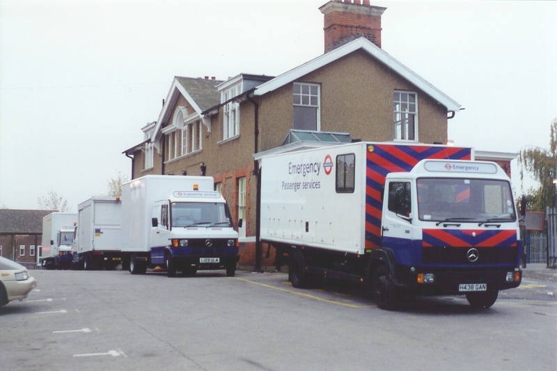 | Details: South Harrow old station building was for a time used as a base by the Emergency Response Unit (ERU) of LUL. James was very fortunate when visiting in about 1994 to find no less than 4 vehicles present. Nearest the camera is Mercedes-Benz 1114 demountable 2496M with body DB2. Parked beyond are three Mercedes-Benz 410D trucks in the form of 2532M, 2531M and 2533M. These all wore plain white and blue livery but were later given the blue and red chevrons as seen on the lorry. | ||||||