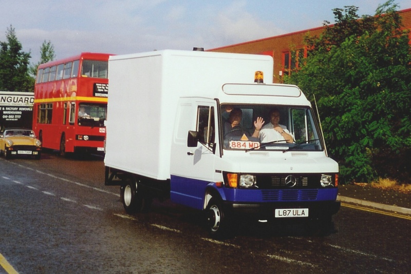 | Details: With a very jolly (if slightly reckless) driver at the wheel, brand-new Mercedes-Benz 410D truck 2530M was seen running on trade plates down Capitol Way in Colindale in August 1993. As this later picture shows, these vehicles subsequently acquired additional cabside windows, and ERU chevrons on bonnet and body. | |||