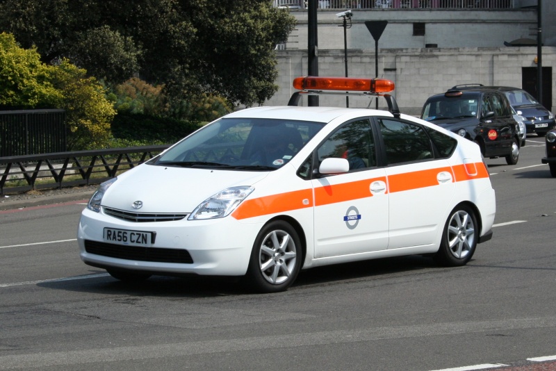 | Details: The sleek (and environmentally friendly) Toyota Prius is a popular choice with the TfL Streets fleet, and most carry this white and orange livery. Some, like RA56CZN seen on Park Lane on 4th May 2007, have been fitted with light-bars and chevron panels on the rear. | |||