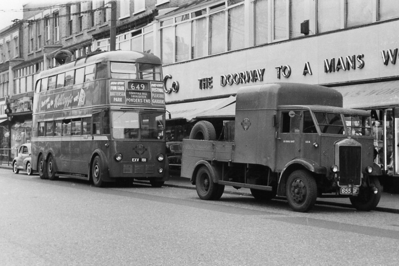 | Details: The diminutive trolleybus rescue trucks had a distinctive design, and stood out by virtue of their red livery complete with Trolleybus roundels. Albion built 12 such vehicles, all based on the KN127 chassis. 122A was photographed on a job from Lea Bridge Depot, with an engineer fiddling with the roof equipment on K2-class trolleybus 1191 behind. | |||