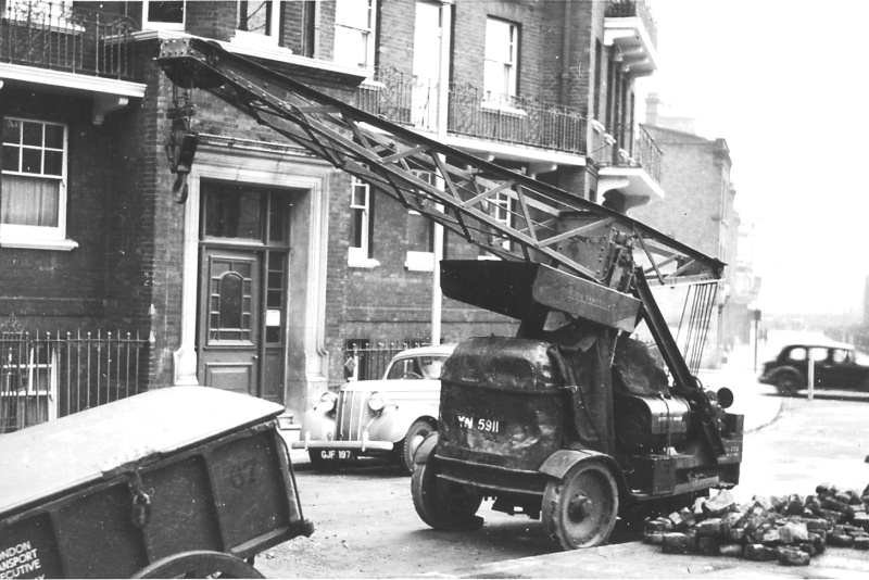 | Details: This curious (and slightly battered) looking vehicle is Ransome & Rapier 4-ton mobile crane 352R. It was used by the tramways permanent way engineers from Deptford Wharf and was photographed on a job on 6th January 1951. Mounted on four solid wheels (the rear wheels being smaller and closer together) it had an open 'cab' protected by a plate roof (on which the LT fleetname has been applied). Note LTE trailer 67 in the foreground. Reproduced by kind permission of Alan Cross. Copyright. | |||