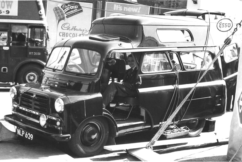 | Details: 989B was slightly special, being a route survey van based on a Bedford CAV van. Painted black with no lettering (apart from on a removable board), it had windows in the raised section and the cab roof to allow observation of clearances along potential bus routes. It was also fitted with a radio and attended major events such as the Epsom Derby. In this view it does appear to be hooked up to various cables and batteries. The Bedford CAV was also used by LT for a pair of works ambulances, with similar bodywork. Reproduced by kind permission of Alan Cross. Copyright. | |||