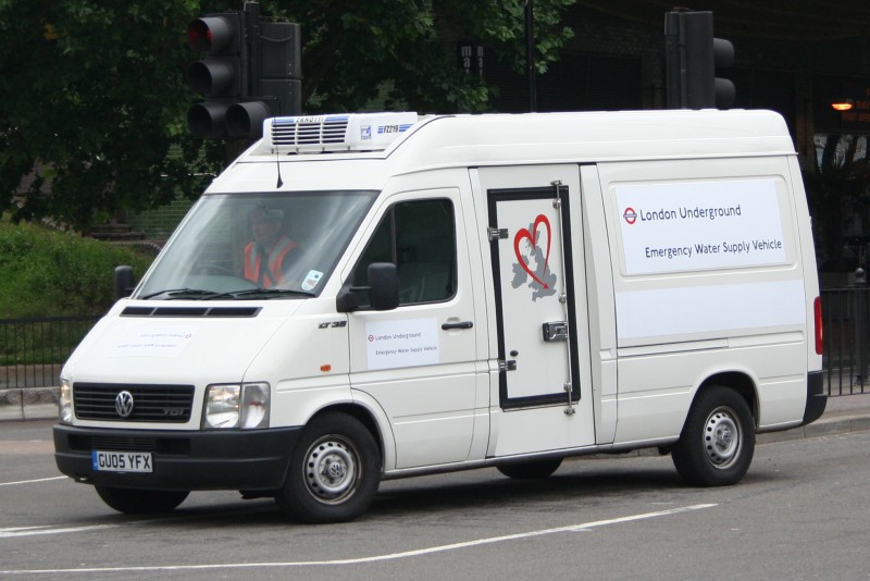 | Details: An unusual vehicle found attending the derailment at Mile End on 5th July 2007 was this VW LT35 van with labels for 'London Underground Emergency Water Supply Vehicle'. The style of the bodywork suggests that this is to transport bottled water for passengers to drink rather than any other purpose. The remnants of a previous operator's livery show that this van must have been acquired second-hand, and it is thought that it is kept at Baker Street (without its detachable signs) when not needed. | ||