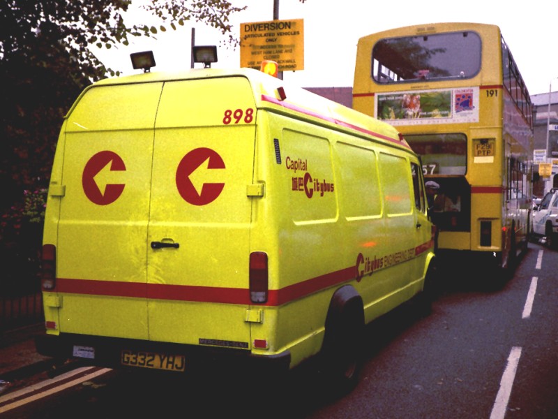 | Details: This picture was taken in West Ham in 1994 and shows Capital Citybus 898 (a Mercedes-Benz 408D van) attending to one of the Dennis Dominators acquired from Southampton. The livery includes the logos and Chinese characters associated with the period when this operator was owned by Hong Kong Citybus. Note also the lemony yellow livery briefly used, compared to the warmer shade on the bus. Capital Citybus (which had evolved from Ensign) was eventually sold to First. | |||
