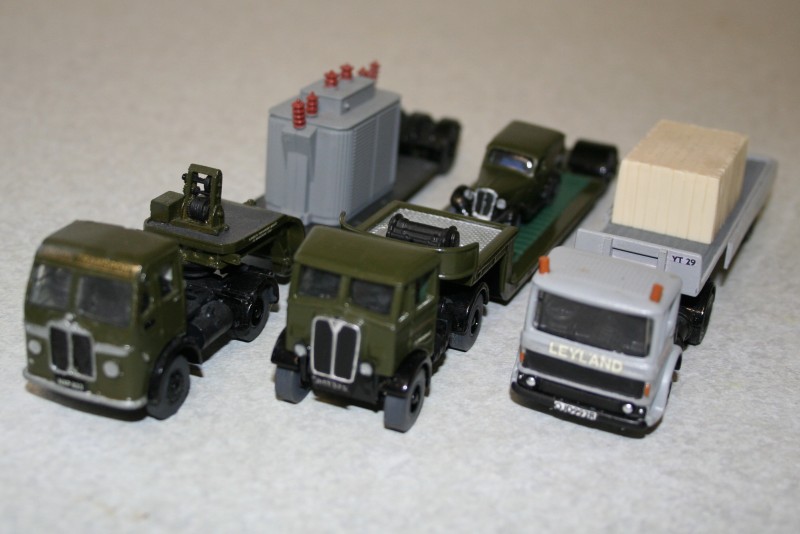 | Details: Articulated lorries from the 1950s, 1940s and 1970s as represented by Kim Rennie's model collection. From the left these are Leyland Beaver 1010L, AEC Matador 603P and Leyland Lynx 1995L with trailer YT29. The varied loads add to the realism. | ||