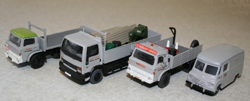 | Details: More models from Kim Rennie's collection, bringing us into the grey era. From the left these are Ford D700 flatbed truck 1722F, a Ford Cargo dropside, a Ford D towing lorry, and an Austin LD van. The leftmost model is interesting as it shows the very rare use of flatbed lorries by LT. As can be seen, most examples were dedicated driver trainers. It also has the short-lived livery of grey with green cab roof. | ||